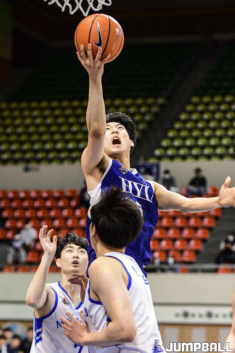 9일 한양대 서울캠퍼스 체육관에서 열린 2022 KUSF 대학농구 U리그 한양대와 명지대의 경기, 한양대 김형준이 레이업슛을 시도하고 있다.