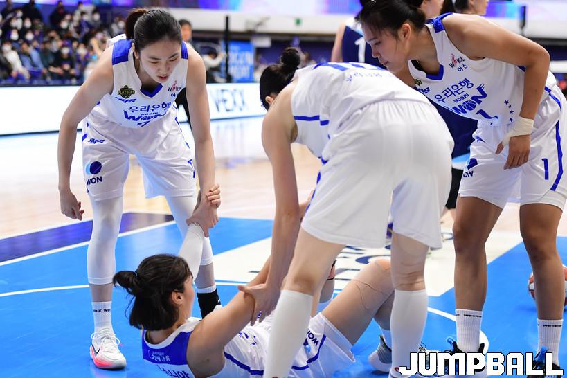 7일 인천도원체육관에서 열린 '삼성생명 2021-2022 여자프로농구 플레이오프' 인천 신한은행과 아산 우리은행의 경기, 우리은행 선수들이 김소니아를 일으켜 세워주고 있다.