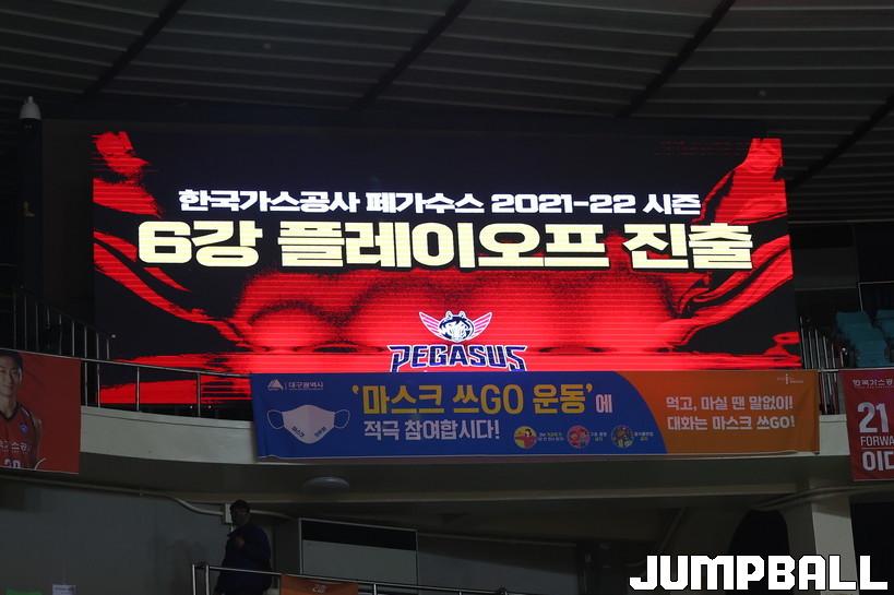 3일 대구실내체육관에서 열린 2021-2022 KGC인삼공사 정관장 프로농구 대구 한국가스공사와 안양 KGC 경기. LG가 KCC전에서 패배해 한국가스공사가 6강 플레이오프를 진출했다. 전광판에 6강 플레이오프 진출을 송출하고 있다.