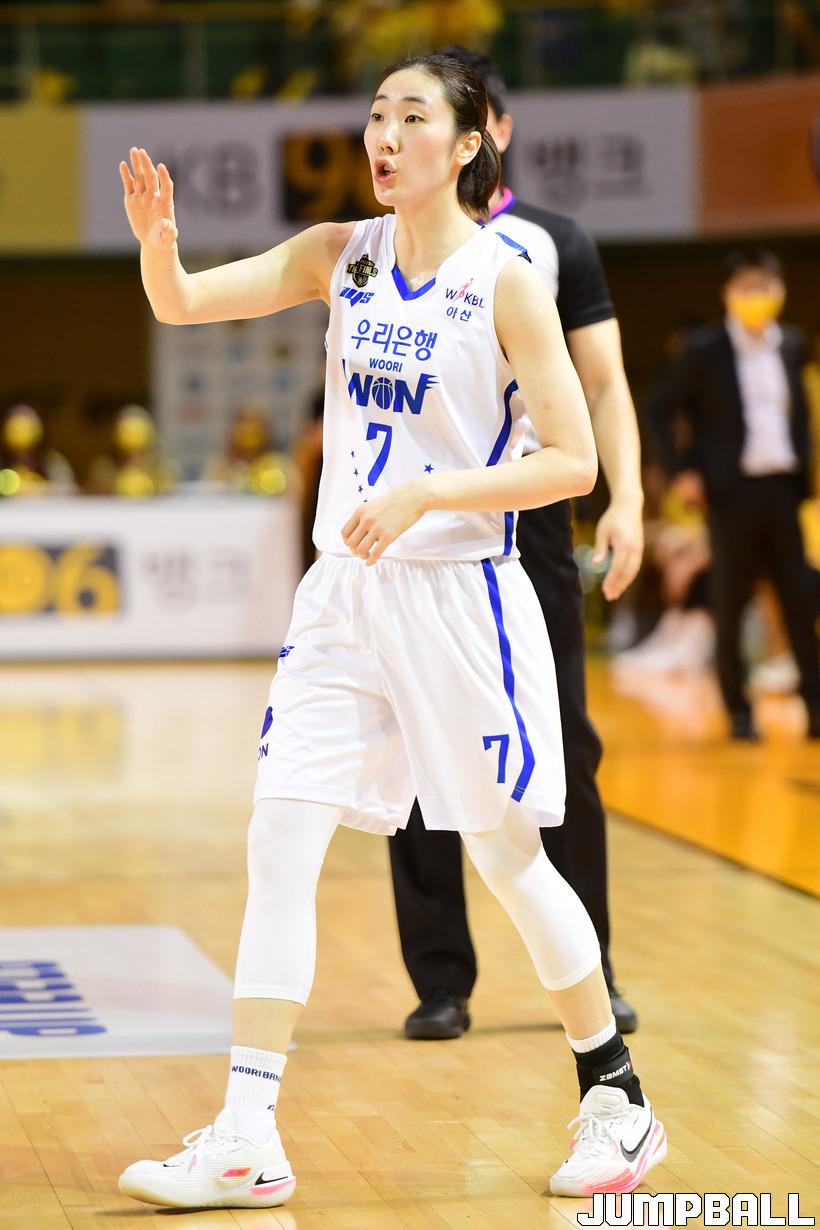 12일 청주실내체육관에서 열린 '삼성생명 2021-2022 여자프로농구 챔피언결정전 2차전' 청주 KB스와 아산 우리은행의 경기, 우리은행 박혜진이 교체되어 들어오고 있다.