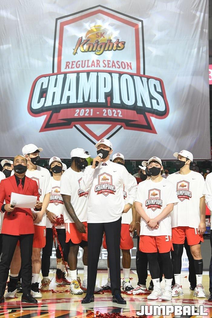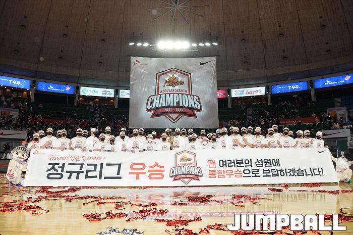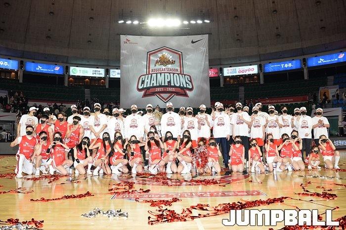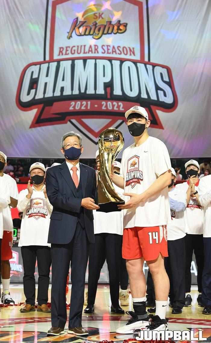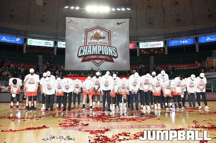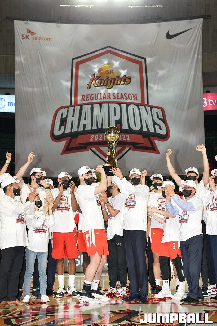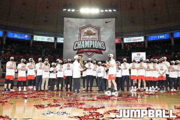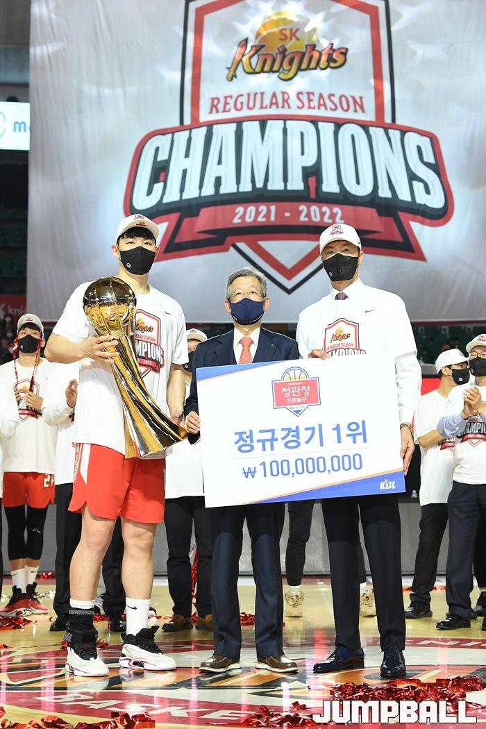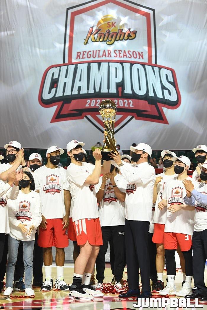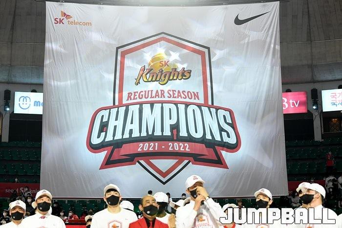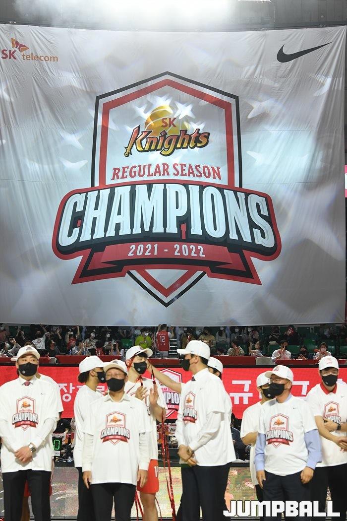 3일 잠실학생체육관에서 열린 2021-2022 KGC인삼공사 정관장 프로농구 서울 SK와 수원 KT의 6라운드 경기, 정규리그 우승을 차지한 SK의 시상식과 우승 세리머니가 진행됐다. SK는 지난 3월 31일 고양 오리온전에서 승리하며 정규리그 우승을 확정했다.