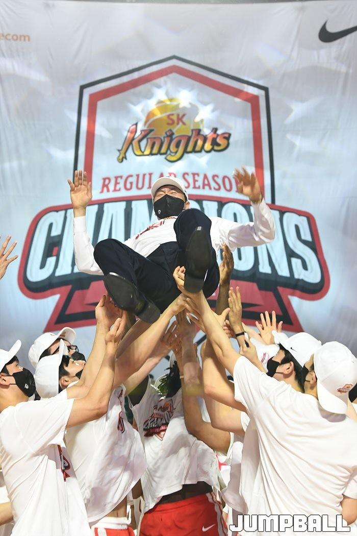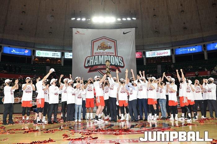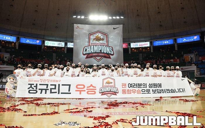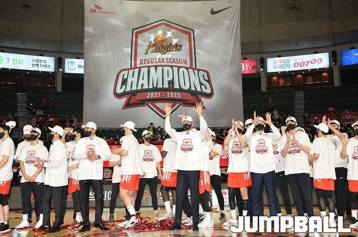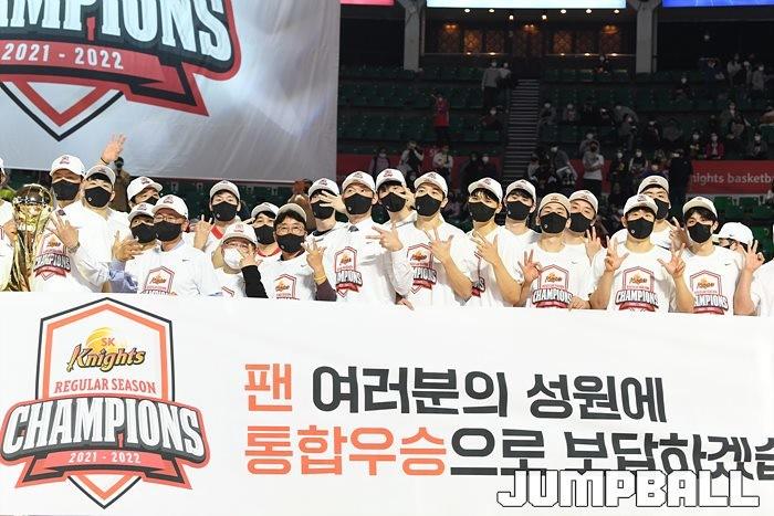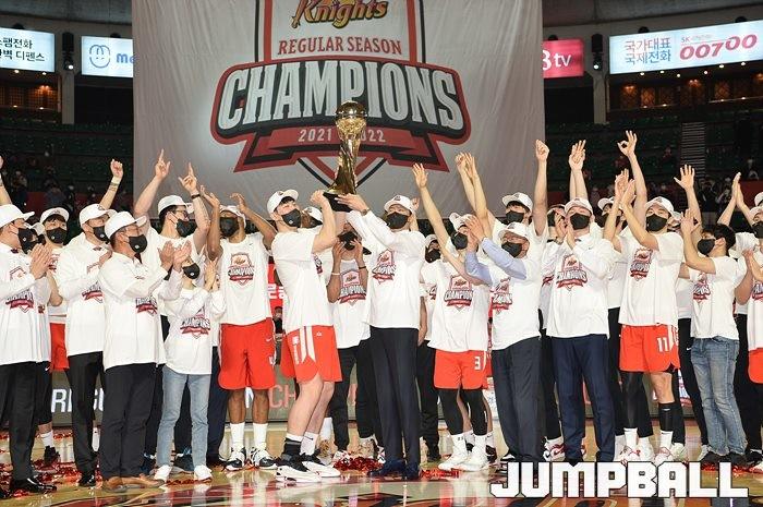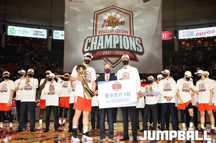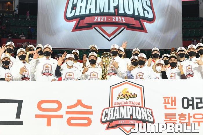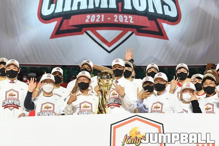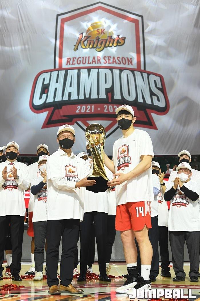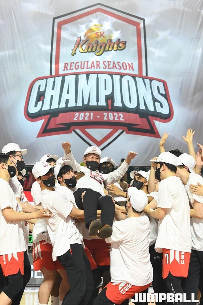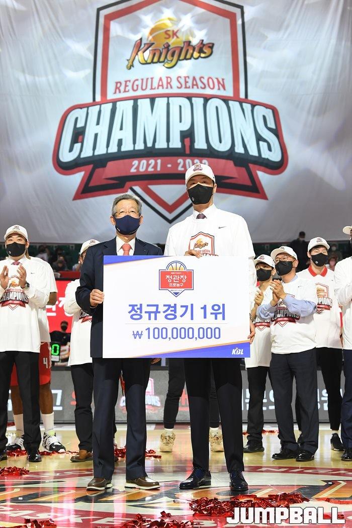 3일 잠실학생체육관에서 열린 2021-2022 KGC인삼공사 정관장 프로농구 서울 SK와 수원 KT의 6라운드 경기, 정규리그 우승을 차지한 SK의 시상식과 우승 세리머니가 진행됐다. SK는 지난 3월 31일 고양 오리온전에서 승리하며 정규리그 우승을 확정했다.