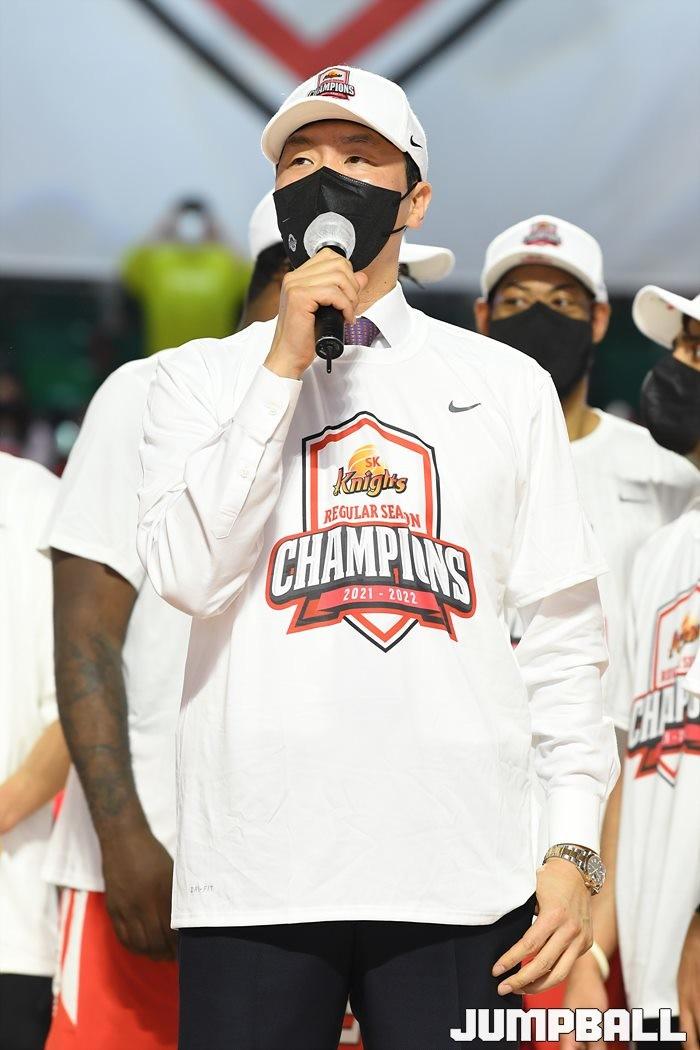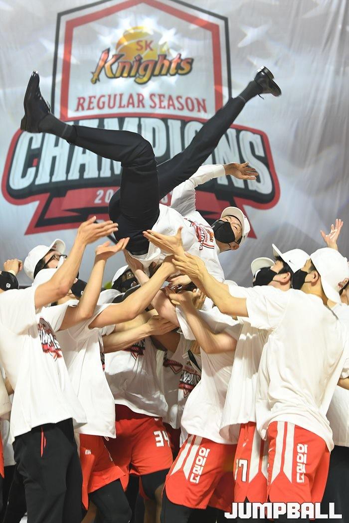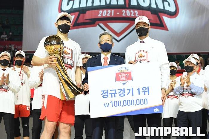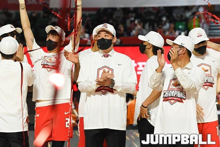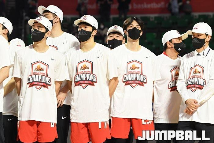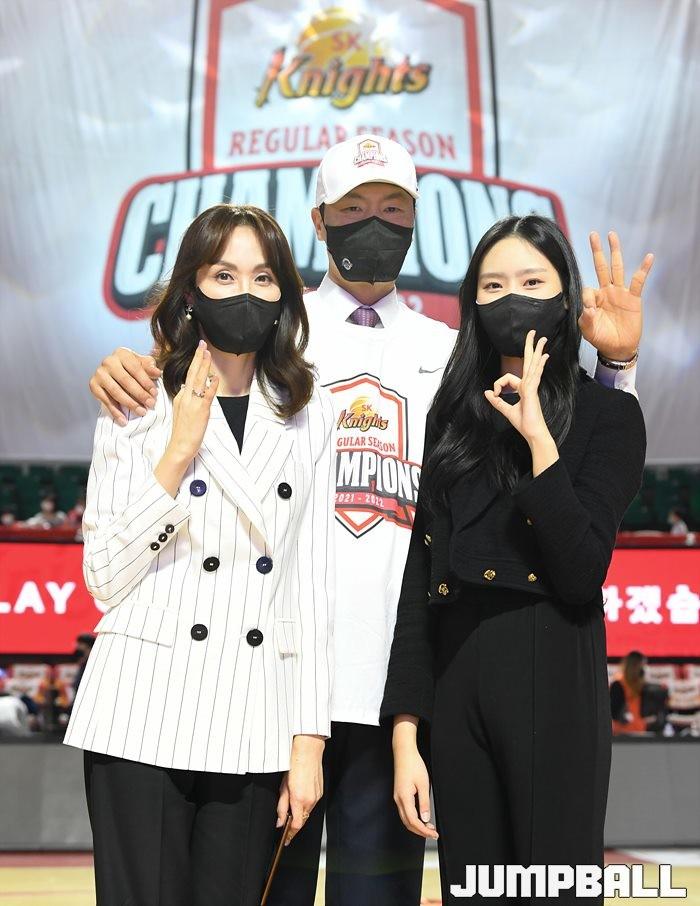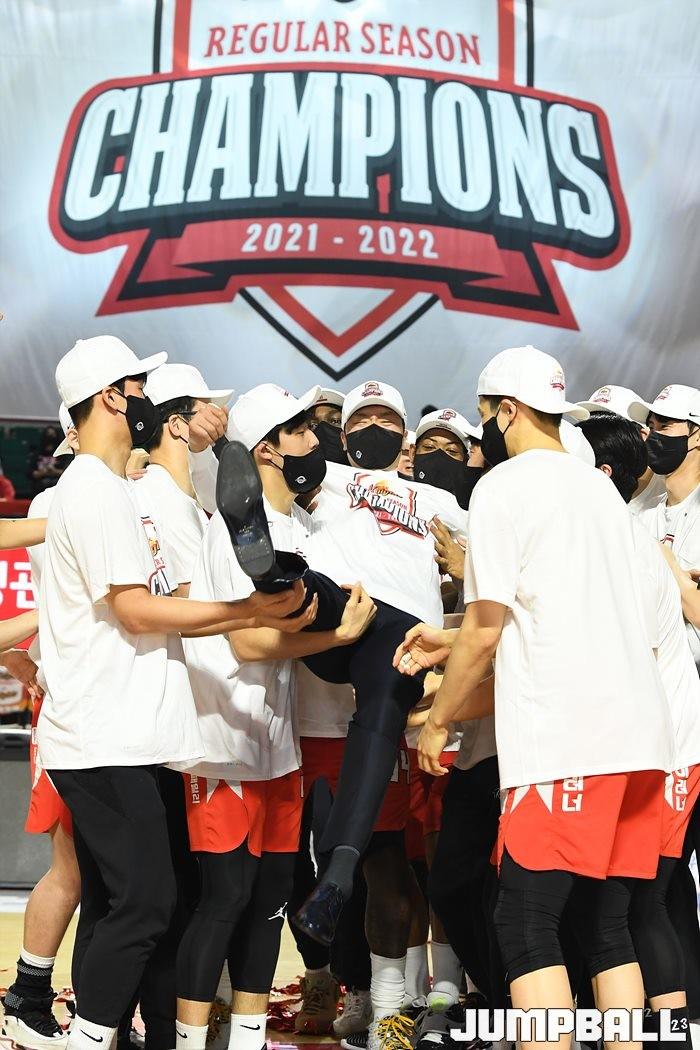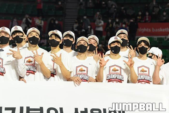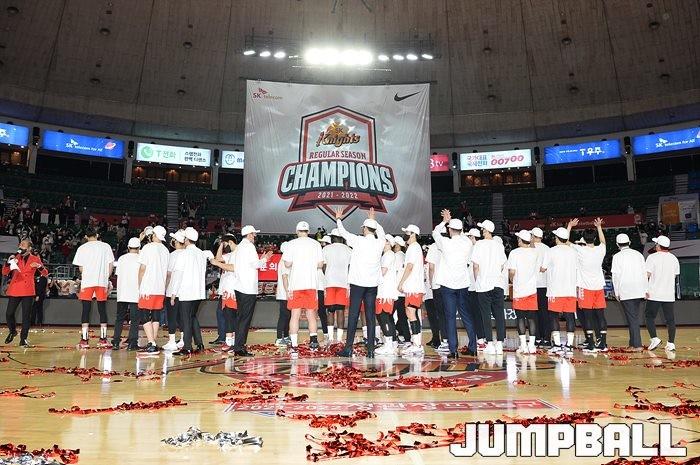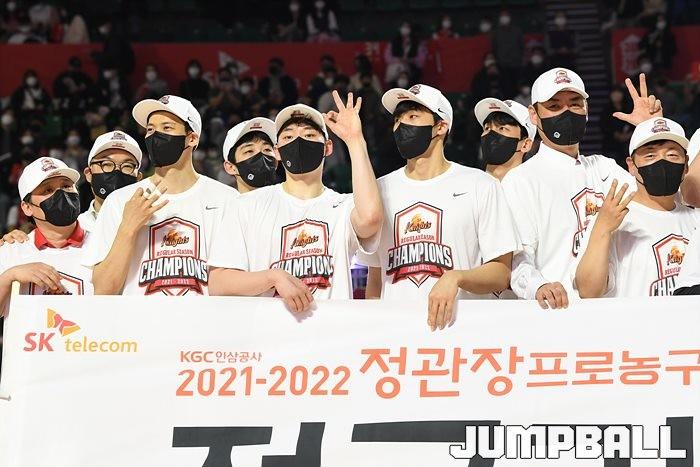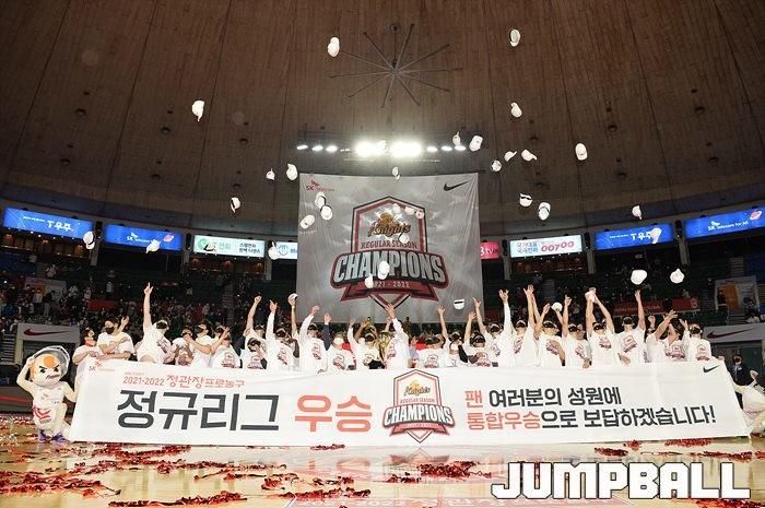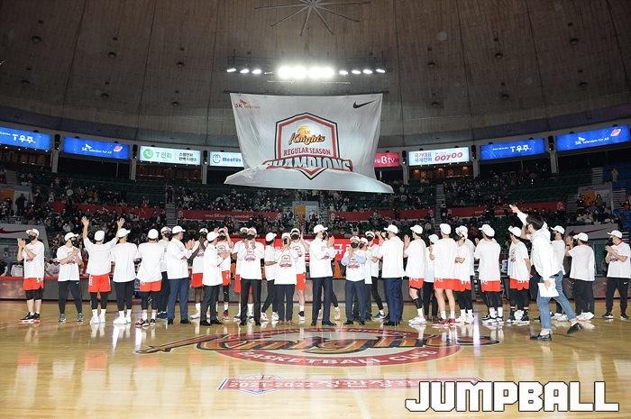 3일 잠실학생체육관에서 열린 2021-2022 KGC인삼공사 정관장 프로농구 서울 SK와 수원 KT의 6라운드 경기, 정규리그 우승을 차지한 SK의 시상식과 우승 세리머니가 진행됐다. SK는 지난 3월 31일 고양 오리온전에서 승리하며 정규리그 우승을 확정했다.