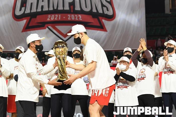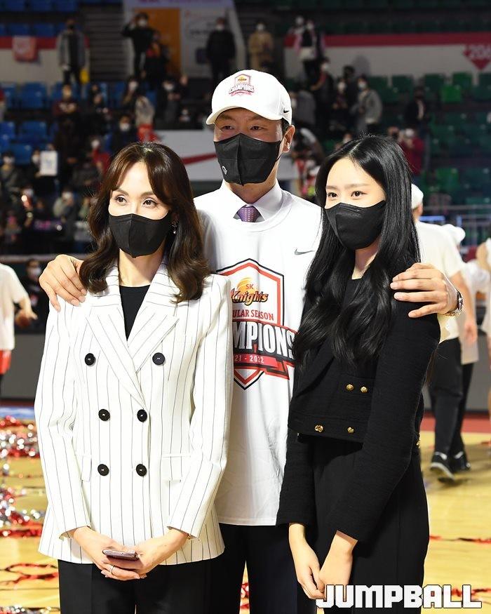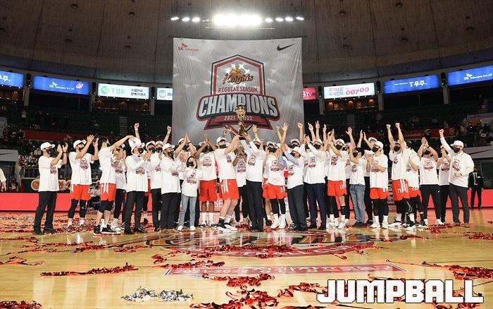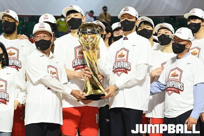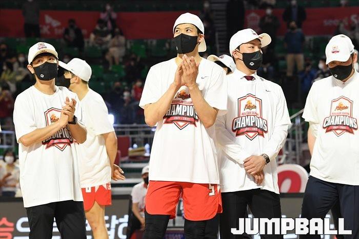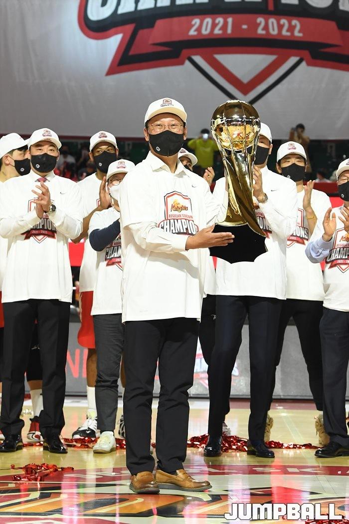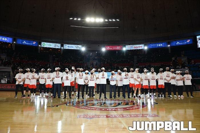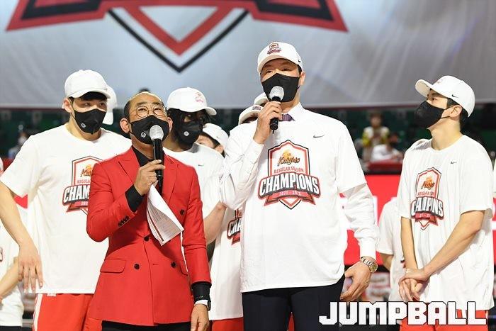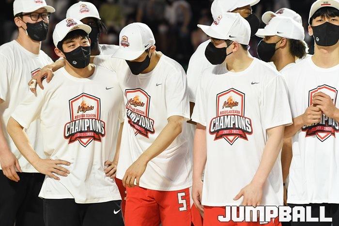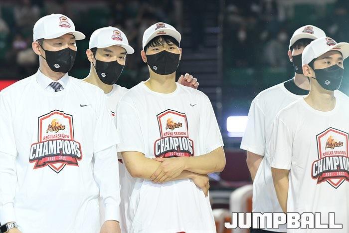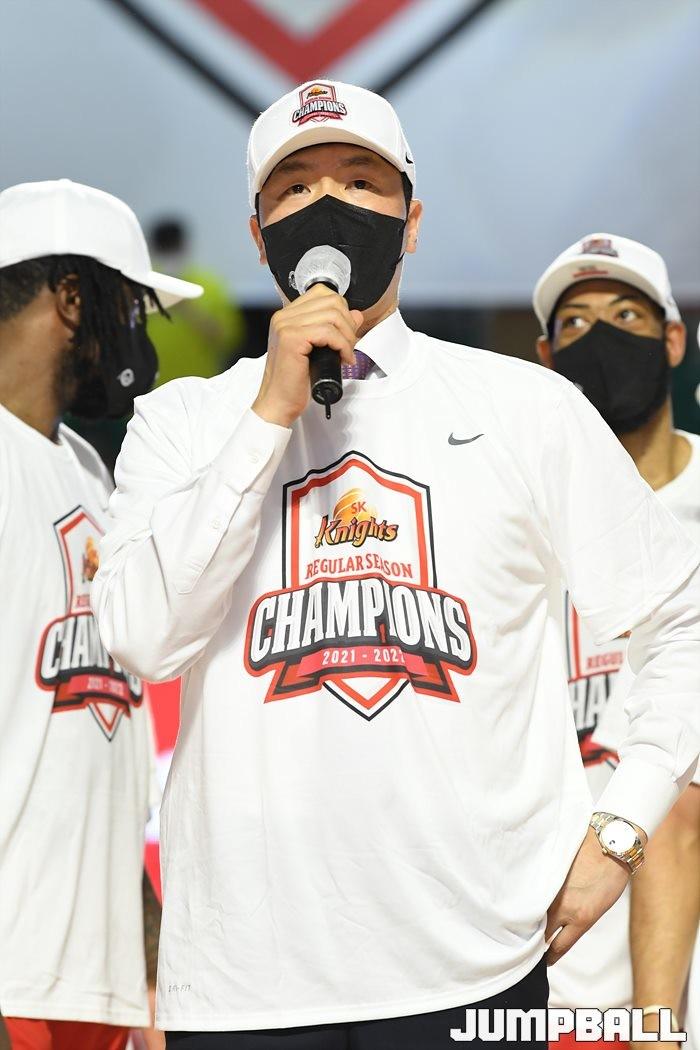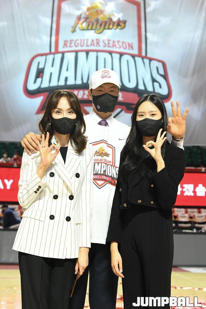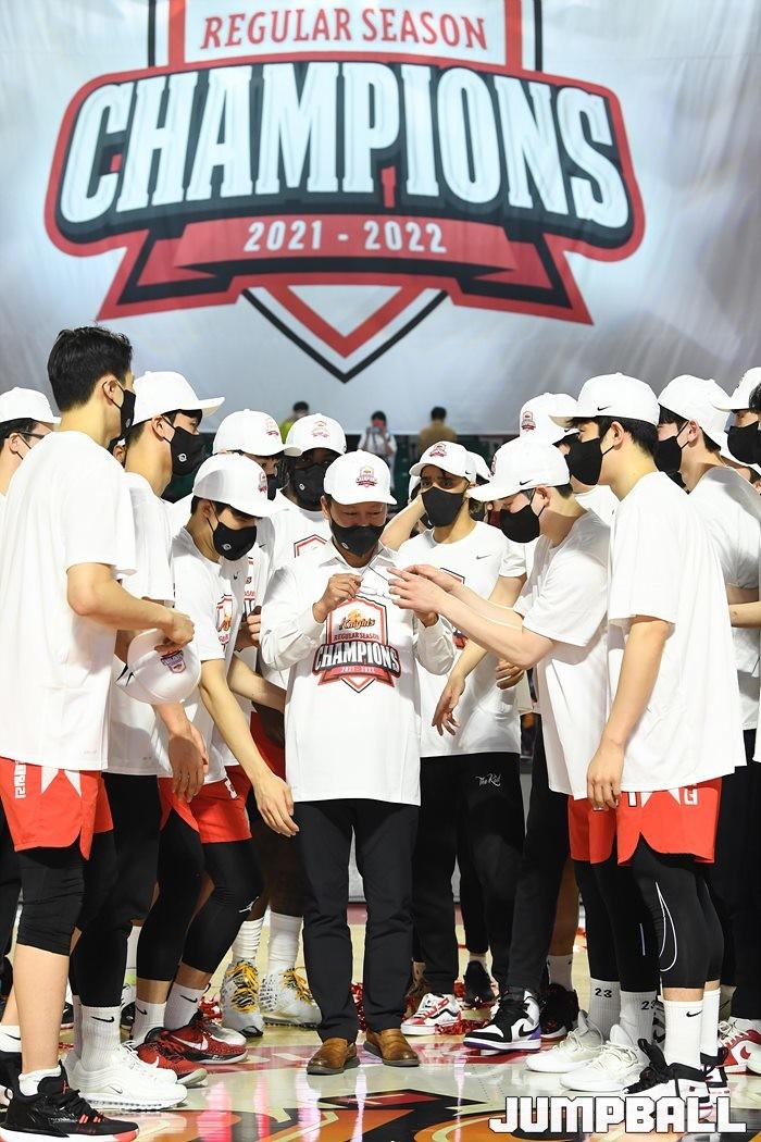 3일 잠실학생체육관에서 열린 2021-2022 KGC인삼공사 정관장 프로농구 서울 SK와 수원 KT의 6라운드 경기, 정규리그 우승을 차지한 SK의 시상식과 우승 세리머니가 진행됐다. SK는 지난 3월 31일 고양 오리온전에서 승리하며 정규리그 우승을 확정했다.