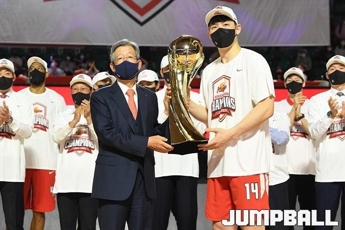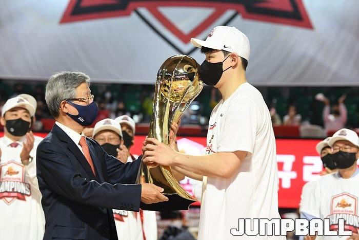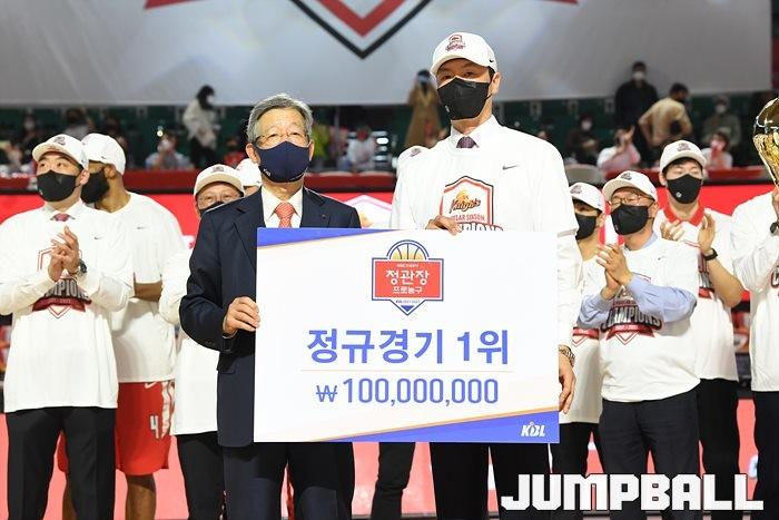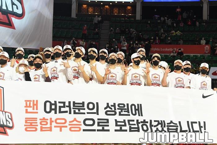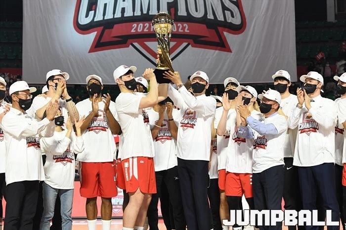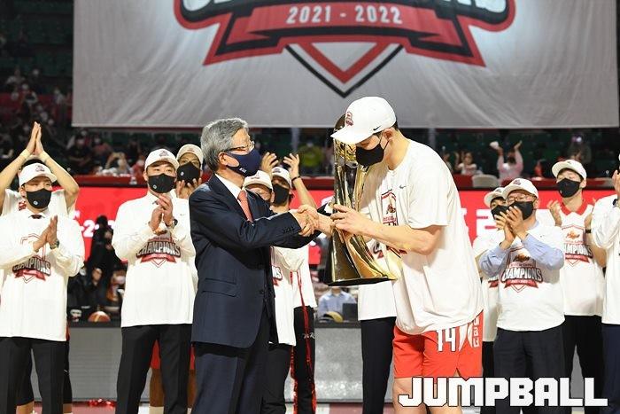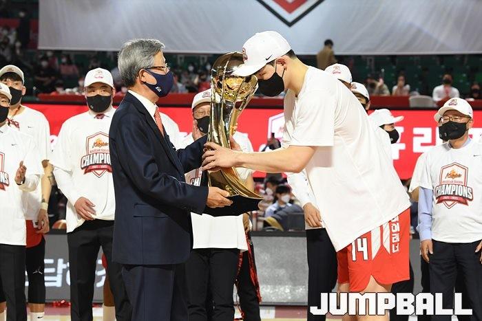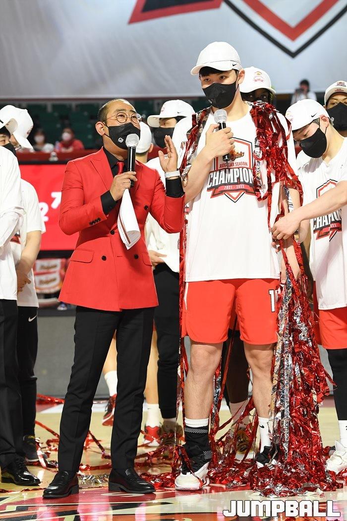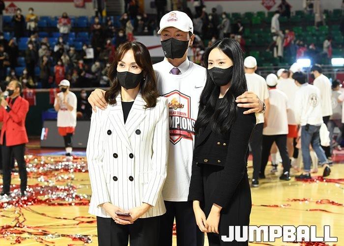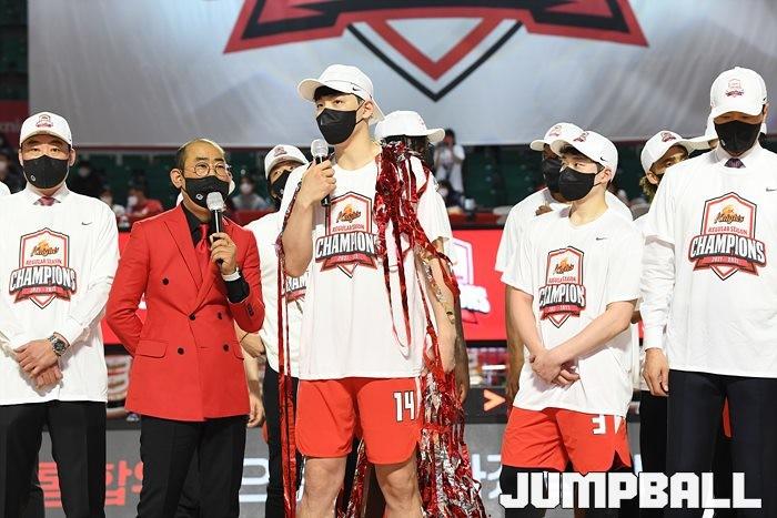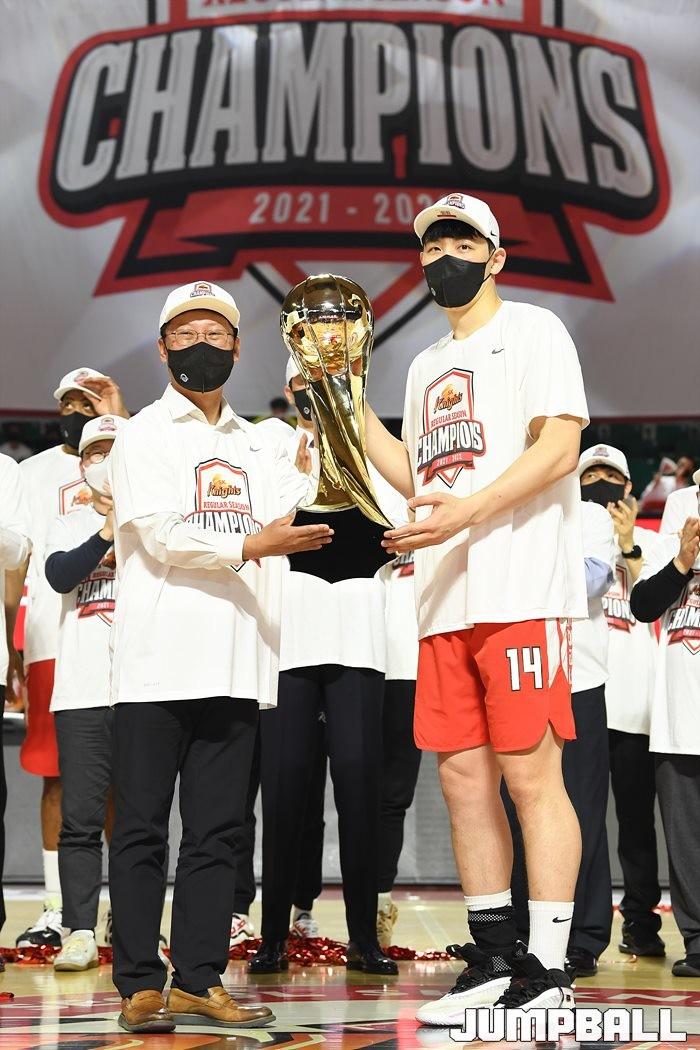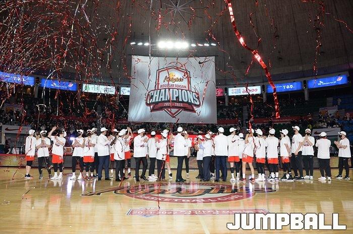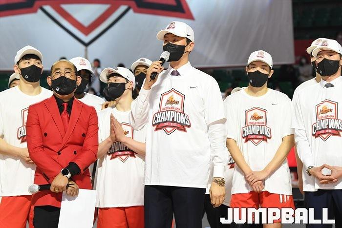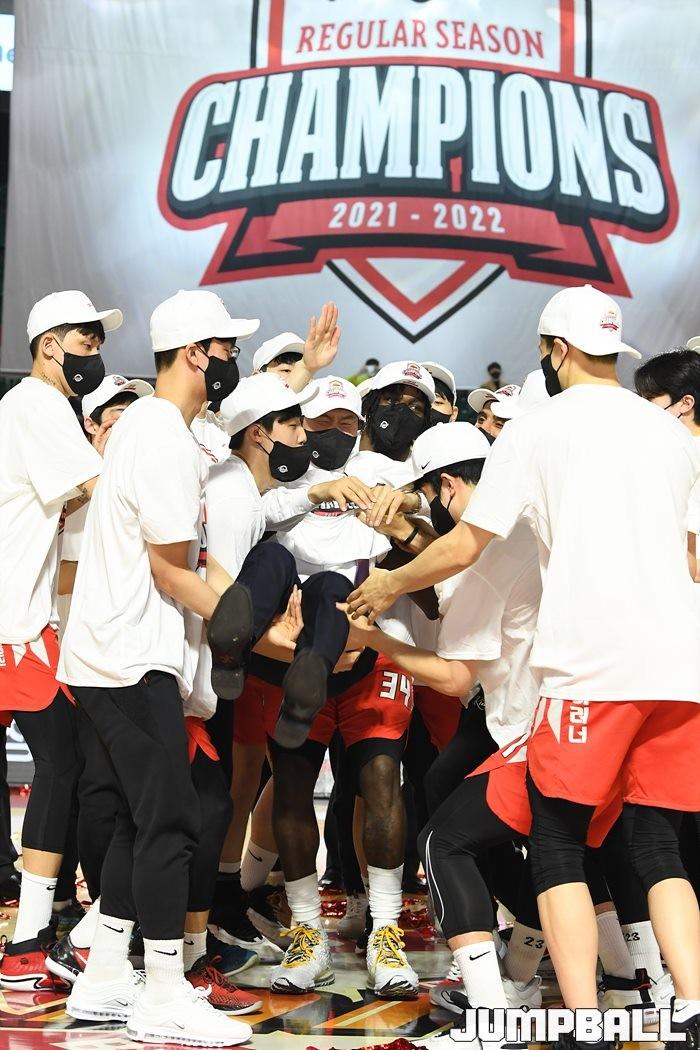 3일 잠실학생체육관에서 열린 2021-2022 KGC인삼공사 정관장 프로농구 서울 SK와 수원 KT의 6라운드 경기, 정규리그 우승을 차지한 SK의 시상식과 우승 세리머니가 진행됐다. SK는 지난 3월 31일 고양 오리온전에서 승리하며 정규리그 우승을 확정했다.