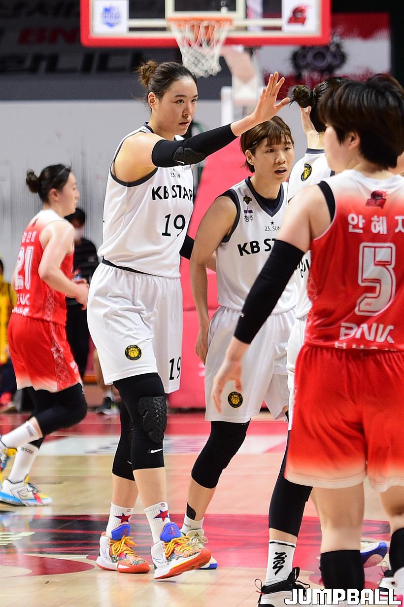 강이슬은 3점슛 3개 포함 23점 4리바운드 4어시스트 2스틸로 활약했다. 김민정(17점 5리바운드 3어시스트)도 두 자리 득점을 올렸다. 박지수는 21분 10초만 출전하고도 12점 12리바운드 3어시스트로 더블더블을 기록했다.