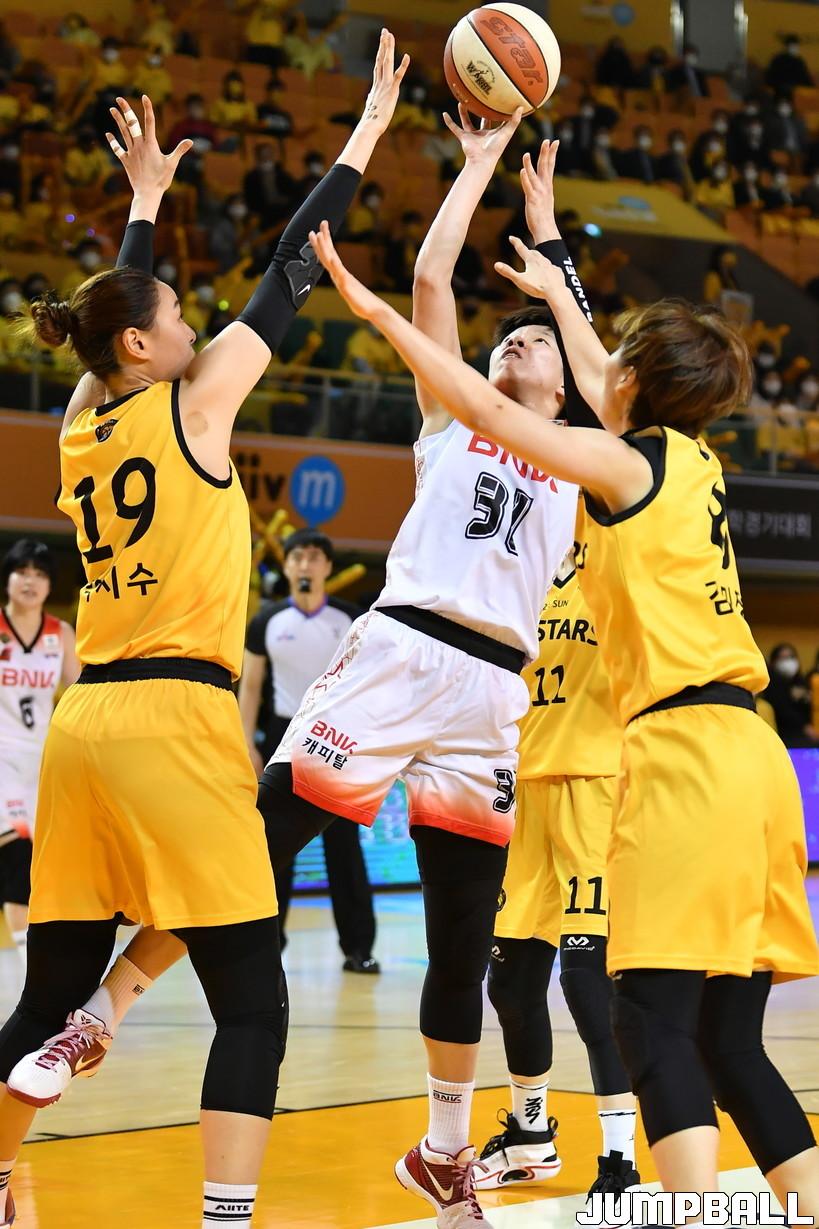 [JB포토] BNK 진안 '상대 수비 앞에서 골밑슛'