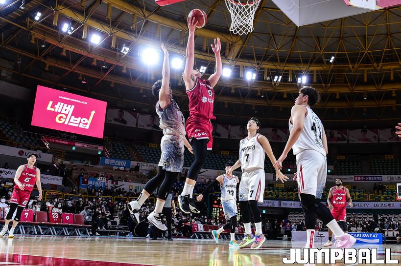 2일 창원실내체육관에서 열린 2021-2022 KGC인삼공사 정관장 프로농구 창원 LG와 안양 KGC인삼공사의 경기, LG 정희재가 레이업슛을 시도하고 있다.