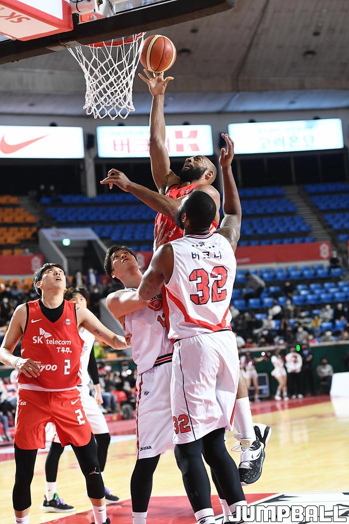 9일 잠실학생체육관에서 열린 2021-2022 KGC인삼공사 정관장 프로농구 서울 SK와 울산 현대모비스의 경기, SK 윌리엄스가 골밑에서 두명의 수비를 뚫고 슛을 시도하고 있다.
