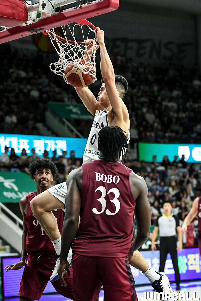[점프볼=안양/유용우 기자] 18일 안양 정관장 아레나에서 열린 한국 남자농구 대표팀과 카타르 대표팀의 평가전, 한국 남자농구대표팀 하윤기가 덩크를 성공하고 있다.