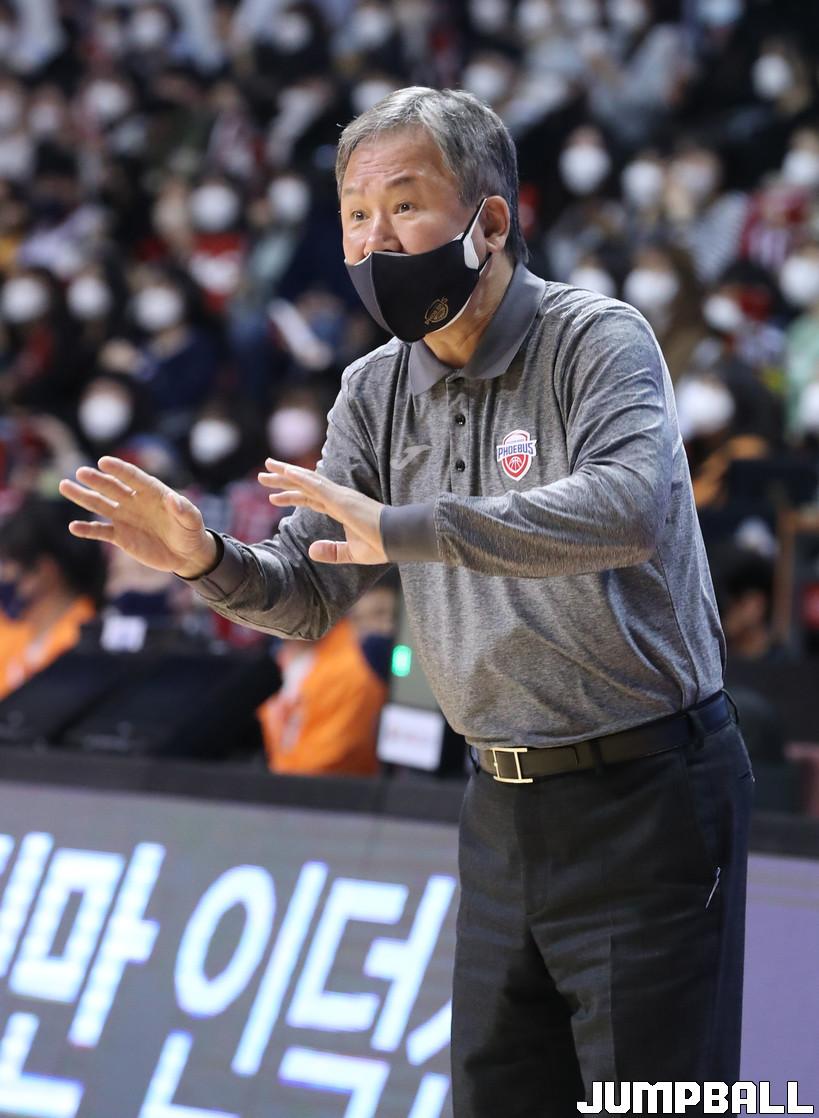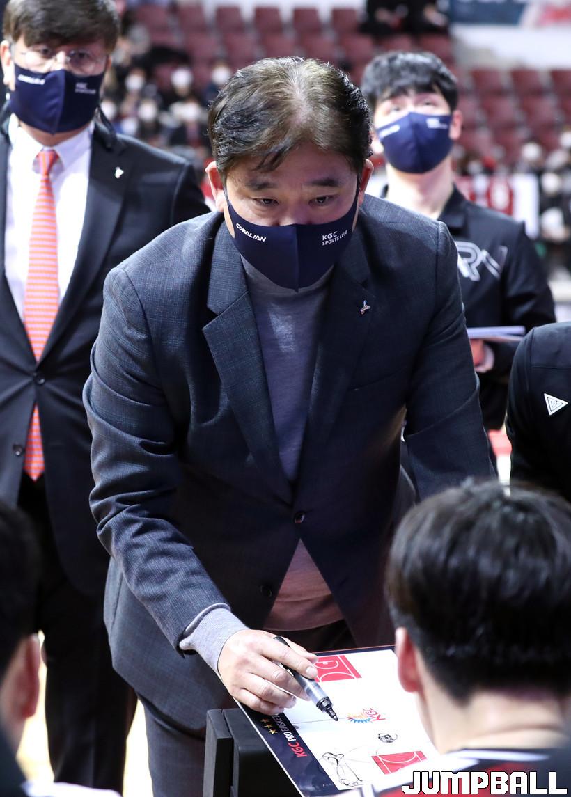KGC 김승기 감독은 “선수들이 대체적으로 잘 풀리는 것 같다. 전반에 슛이 조금 안 들어가서 고전했는데 후반 들어 (전)성현이 움직임이 좋아졌고, 수비도 잘 된 것 같다”는 승리 소감을 말했다.