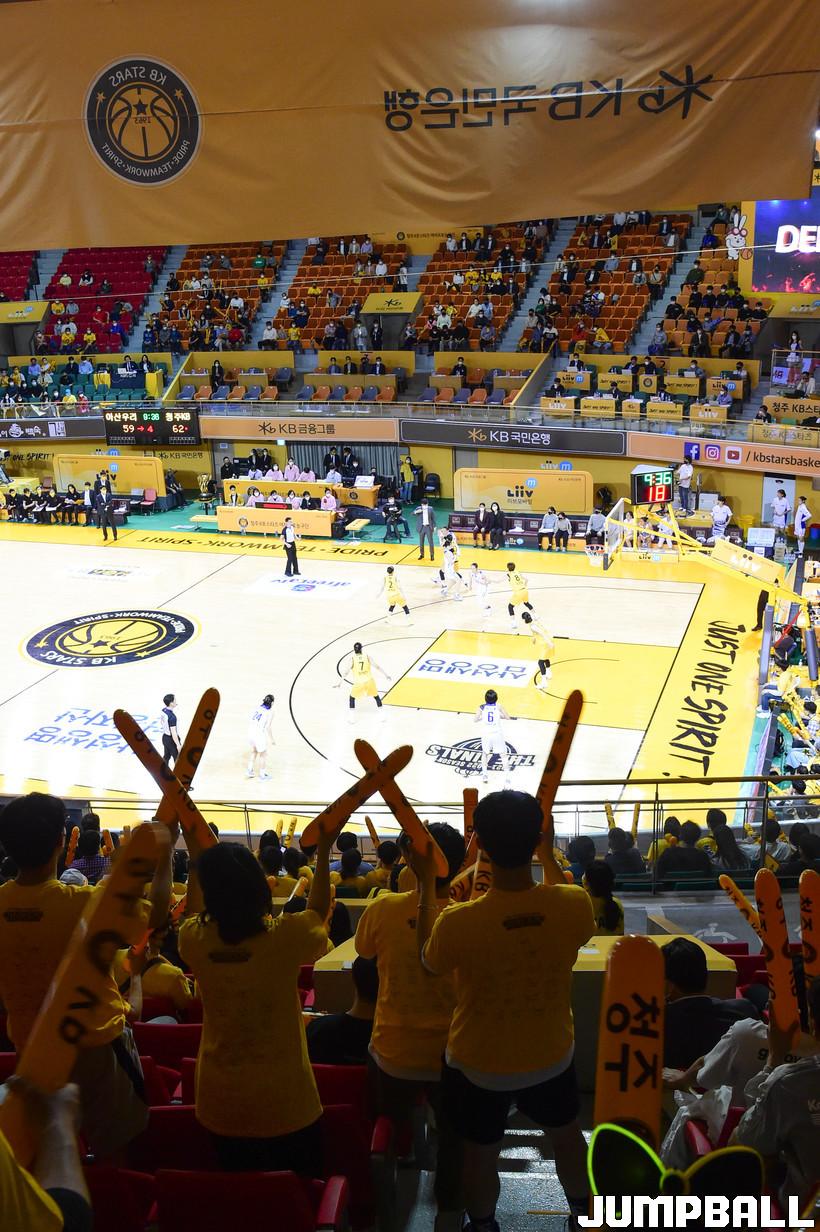 12일 청주실내체육관에서 열린 '삼성생명 2021-2022 여자프로농구 챔피언결정전 2차전' 청주 KB스와 아산 우리은행의 경기, KB팬들이 KB를 응원하고 있다.