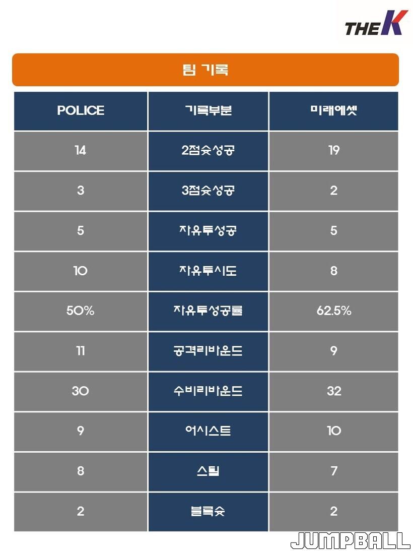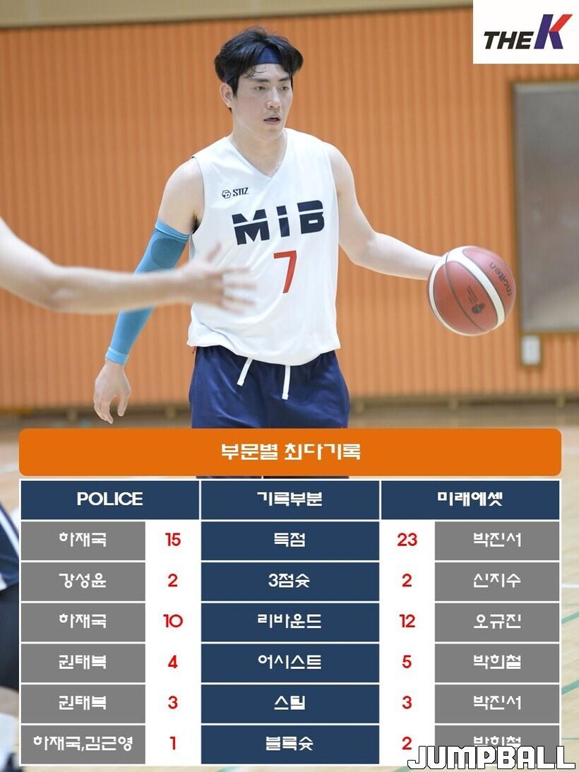 하지만, POLICE 역시 슛 성공률이 낮았다. 유독 슛감이 좋았던 강성윤과 양정근이 연거푸 슛을 던졌지만, 림을 빗나가며 점수차를 좁히지 못했다. 미래에셋은 수비를 더욱 강화하며 실점을 최소화했다. 시간은 어느덧 종료를 향해 있었고, 버저가 울리며 양팀 모두 경기를 마무리했다.