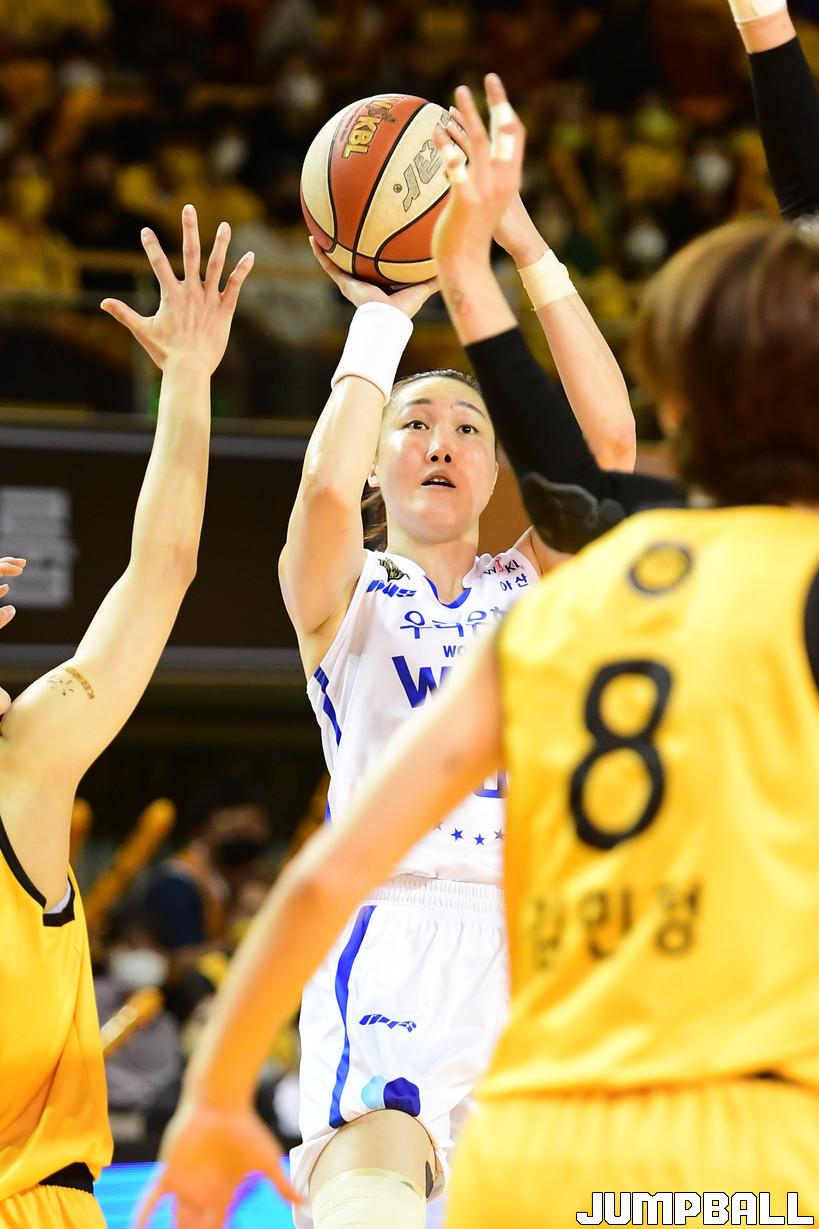 12일 청주실내체육관에서 열린 '삼성생명 2021-2022 여자프로농구 챔피언결정전 2차전' 청주 KB스와 아산 우리은행의 경기, 우리은행 김정은이 슛을 시도하고 있다.