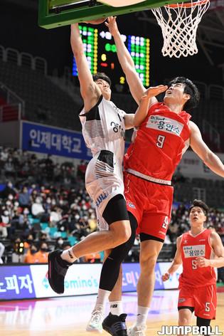 12일 고양체육관에서 열린 2021-2022 KGC인삼공사 정관장 프로농구 고양 오리온과 수원 KT의 경기, KT 하윤기가 골밑에서 슛을 시도하고 있다.