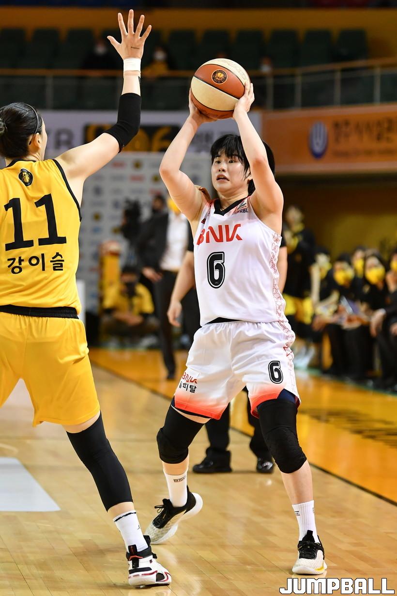 31일 청주실내체육관에서 열린 '삼성생명 2021-2022 여자프로농구 플레이오프' 청주 KB와 부산 BNK의 경기. BNK 이소희가 동료에게 패스를 건네려 상대 수비의 틈을 보고 있다.