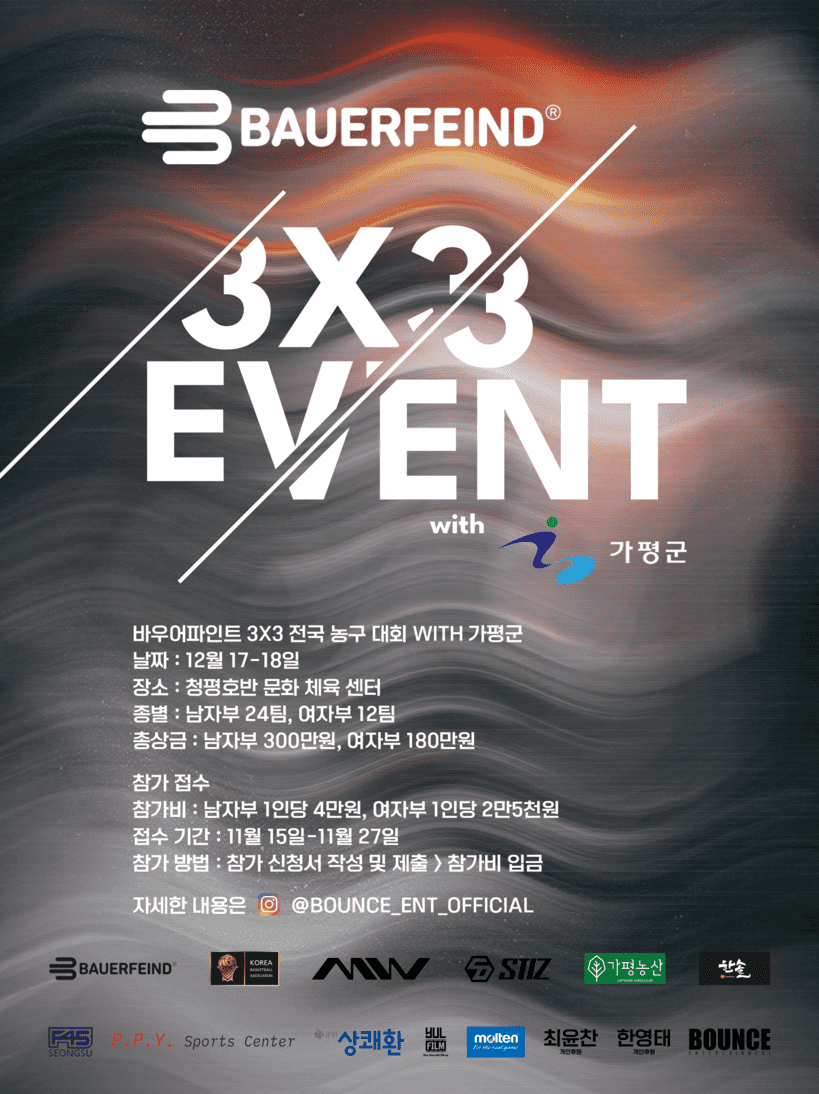 한편, 국내 3x3계에 새 바람을 일으킬 바우어파인트 3x3 전국농구대회에선 바우어파인트를 비롯해 대한민국농구협회, 마스터욱, 스티즈, 몰텐, 가평농산, 바운스 엔터테인먼트, F45성수, P.P.Y, 스포츠센터, 큐원상쾌환, 율 필름, 한솔레미콘, 최윤찬(개인), 한영태(개인) 등 많은 후원이 이뤄진 덕분에 현장에서는 2점슛 챌린지, 자유투 챌린지 등 선수들 뿐만 아니라 관중들을 위한 다채로운 이벤트가 선보일 예정이다.