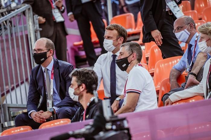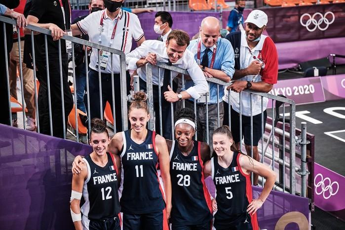 올림픽 3x3 경기장을 찾은 마크롱 대통령은 관중석에서 FIBA의 안드레아스 자클리스 사무총장과 담소를 나눈 뒤 경기를 끝낸 프랑스 여자 3x3 대표팀을 역시나 관중석에서 격려하는 모습을 보였다.