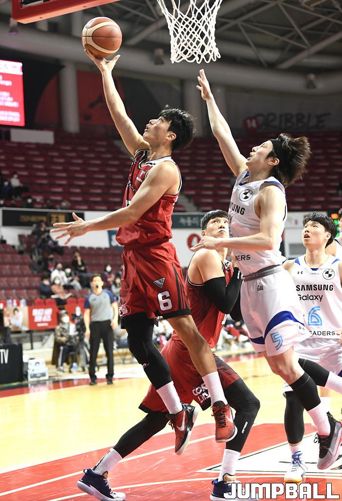 22일 안양실내체육관에서 열린 2021-2022 KGC인삼공사 정관장 프로농구 안양 KGC인삼공사와 서울 삼성의 경기, KGC 박지훈이 골밑 사이드로 파고들어 슛을 시도하고 있다.