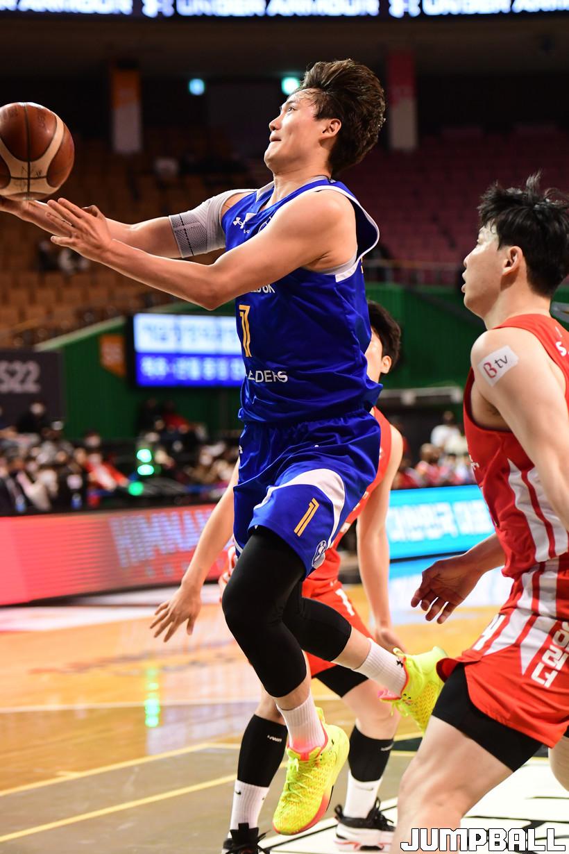 4일 잠실실내체육관에서 열린 2021-2022 KGC인삼공사 정관장 프로농구 서울 삼성과 서울 SK의 S-더비 6차전 경기, 삼성 이동엽이 레이업슛을 시도하고 있다.
