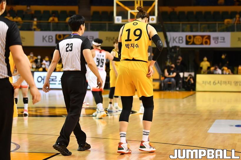 박지수는 이날 BNK 김한별과 자주 매치업을 이뤘다. 두 선수는 지난 시즌 챔피언결정전에서도 매치업을 이뤘는데, 당시에는 김한별이 박지수를 괴롭히며 삼성생명의 챔피언결정전 우승을 이끌었다.