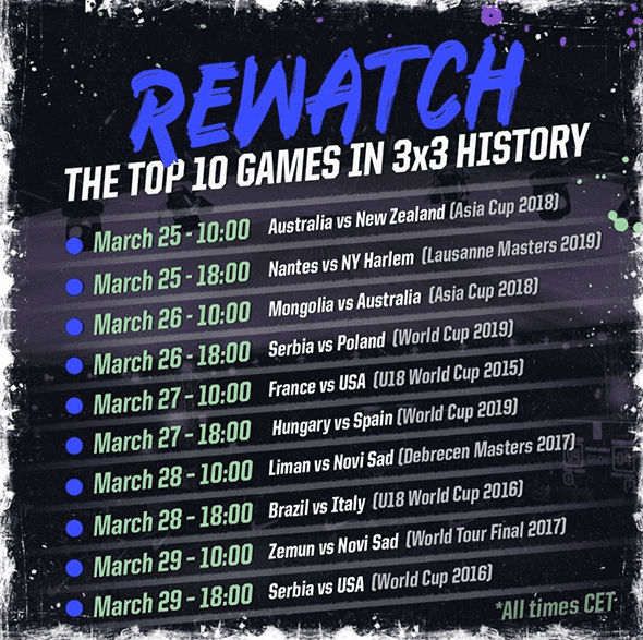 월드투어와 월드컵, 아시아컵 등 그동안 펼쳐진 FIBA 3x3 경기들 중 팬들의 이목을 사로잡을 만한 10경기를 선정한 FIBA는 하이라이트를 제작해 공개했다. FIBA는 여기서 그치지 않고 3월25일부터 해당 경기들의 풀영상을 순차적으로 FIBA 3x3 유튜브 채널을 통해 중계하고 있기도 하다.