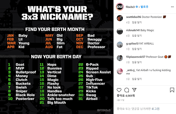 FIBA는 지난 17일 공식 SNS에 자신의 생일을 통해 별명을 지을 수 있는 콘텐츠를 올렸다. 본인이 태어난 달과 태어난 날짜를 조합해 별명을 지을 수 있는 이 콘텐츠에는 670개의 댓글이 달렸고, 반응 역시 뜨거웠다.