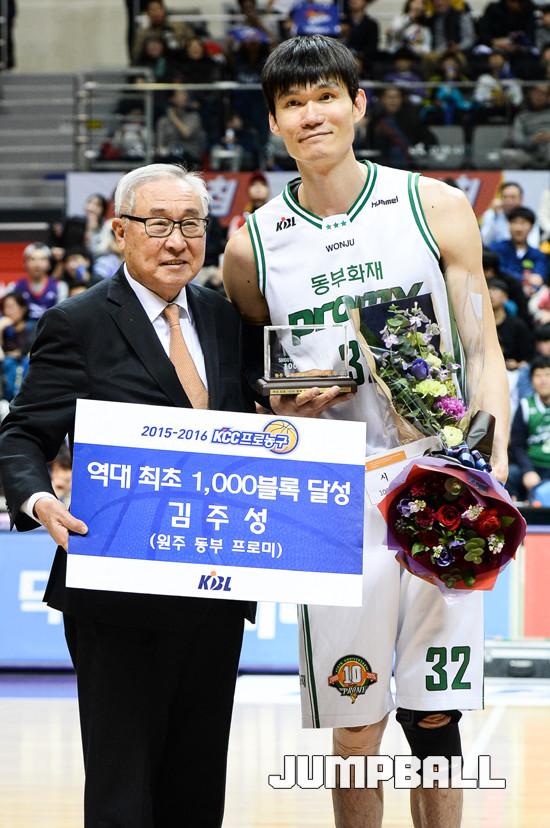 원주 동부 김주성은 30일 고양실내체육관에서 열린 2015-2016 KCC 프로농구 고양 오리온과의 경기에서 KBL 역대 통산 1호(정규리그)로 1,000블록 기록을 세웠다.