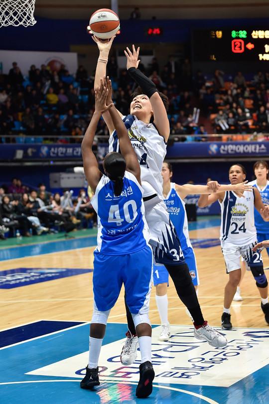 1일 인천도원체육관에서 열린 여자프로농구 신한은행과 우리은행의 경기. 이날 양 팀은 연장전까지 가는 접전을 펼쳤다.