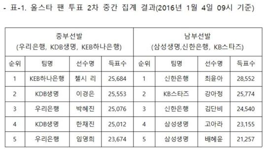 WKBL은 지난해 12월 15일부터 WKBL 공식 홈페이지에서 진행하고 있는 KDB생명 2015-2016 여자프로농구 올스타전 온라인 팬 투표 2차 집계 결과 (1월 4일 오전 09시 기준)를 발표했다.