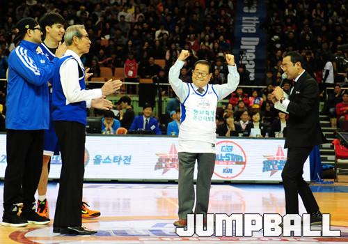 10일 잠실실내체육관에서 열린 2015-2016 KCC 프로농구 올스타전. 시구자의 오래 전 사진이 전광판에 소개되자 관중석이 술렁였다. 그리곤 ‘설마’하던 그 분이 등장했다. ‘국민 MC’ 송해(89)가 주인공이었다.