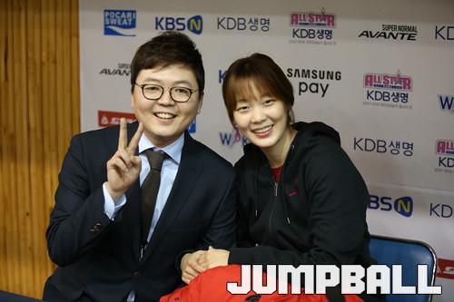 17일 당진 실내체육관에서 열린 2015-2016 여자프로농구 올스타전, 일일 해설자로 나선 KEB하나은행의 신지현이 김기웅 캐스터와 경기전 다정한 포즈를 취하고 있다.