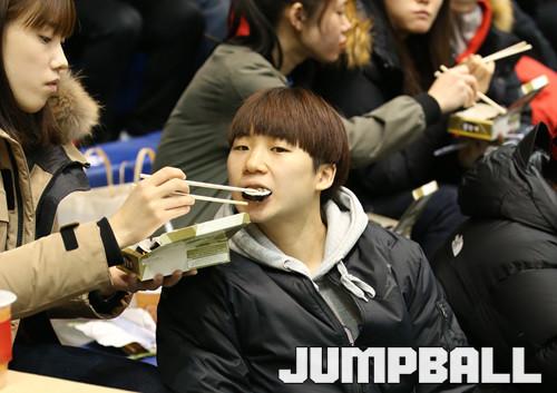 17일 당진 실내체육관에서 열린 2015-2016 여자프로농구 올스타전, 본격적인 행사에 앞서 경기장을 찾은 우리은행 최정민이 동료가 주는 김밥을 맛있게 먹고 있다.