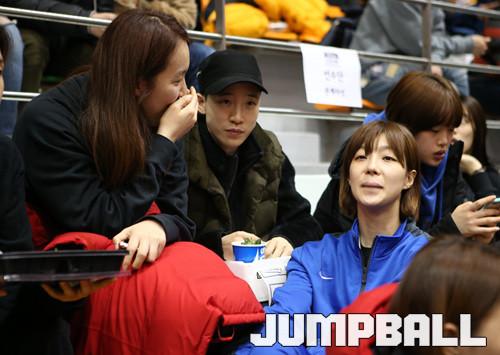 17일 당진 실내체육관에서 열린 2015-2016 여자프로농구 올스타전, 본 경기에 앞서 경기장을 찾은 김수연, 이경은, 박태은이 관중석에 앉아 수다를 떨고 있다.