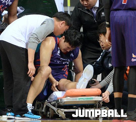 이날 오리온은 주전 포워드 김동욱이 1쿼터 0.8초를 남기고 발목을 다쳤다. 점프를 하고 내려오면서 상대 발을 밟고 왼쪽 발목이 꺾인 것.