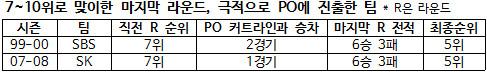 8개팀 3라운드 제도로 운영된 원년시즌을 제외하면, 10개팀이 플레이오프를 두고 경쟁한 건 18시즌이다. 이 가운데 마지막 라운드를 맞이하기 직전인 시점, 7~10위에 머물던 팀이 플레이오프에 진출한 사례는 단 2팀이다.
