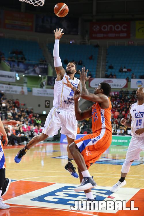 KCC는 경기 종료 1분여를 남기고 에밋이 개인기로 전자랜드 수비를 따돌린 뒤 돌파 득점에 성공하며 92-91, 1점 차 리드를 잡았다. 이어진 전자랜드의 공격에선 포웰이 반칙으로 얻은 자유투 2구 중 하나를 성공하며 92-92 동점을 만들었다.