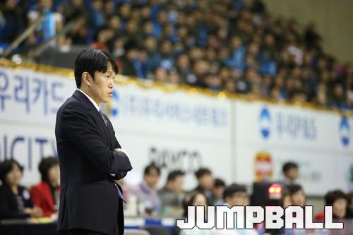 7일 춘천 호반실내체육관에서 열린 KDB생명 2015-2016 여자프로농구 정규리그 춘천 우리은행과 청주KB스타즈의 경기, 춘천 우리은행 위성우 감독이 팔짱을 낀채 코트 위의 경기를 지켜보고 있다.