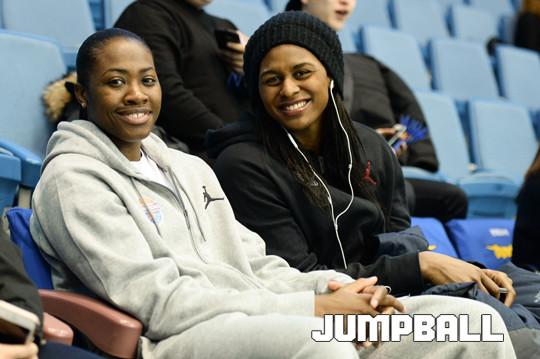 [점프볼=잠실실내/곽현 기자] 8일 잠실실내체육관에서 열린 삼성과 오리온의 프로농구 경기에서 익숙한 얼굴이 눈에 띄었다. 바로 여자프로농구 춘천 우리은행의 정규리그 우승을 이끈 외국선수 콤비 쉐키나 스트릭렌과 사샤 굿렛이다.