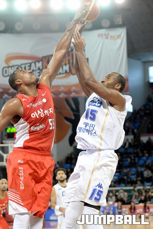 웬델 맥키네스(동부)선수요. 몸을 기대면서 블록을 피하고 슛을 많이 쏴요. 아무래도 타이밍을 맞추기 힘들어요.