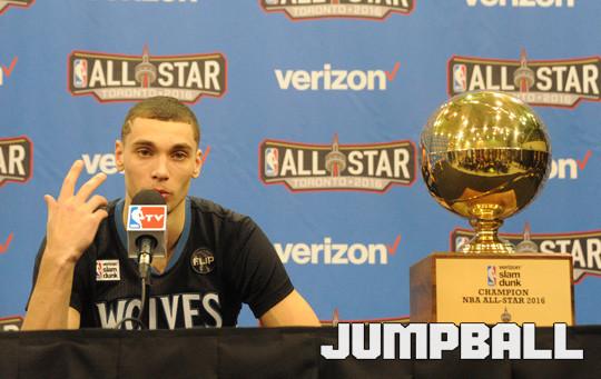 NBA는 이번 올스타 기간 동안 에어캐나다 센터 3층에 위치한 랩터스 훈련 코트를 기자회견실로 사용했다. 절반은 인터뷰를 위한 공간으로, 절반은 각종 대회 참가자들을 위한 웜업 공간으로 사용했다. 타운스가 인터뷰를 하기 직전까지, 라빈은 밀러와 슬램덩크 대회 연습을 하고 있었다.