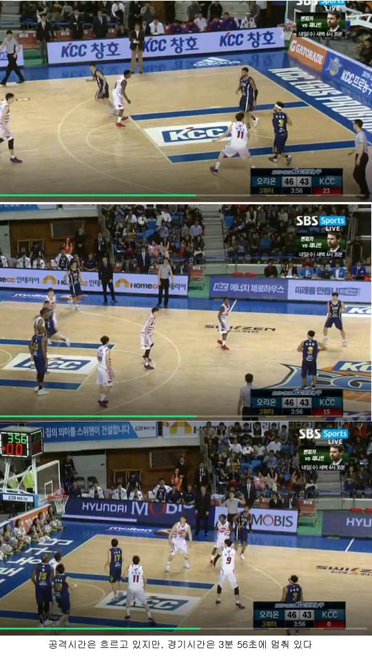 3쿼터 3분 56초를 남기고 오리온 허일영이 자유투를 던지고 KCC의 공격 상황이었다. KCC 선수들이 공격을 진행하던 이 때 전광판의 공격제한시간은 흐르는데, 경기시간이 흐르지 않았던 것이 확인됐다.