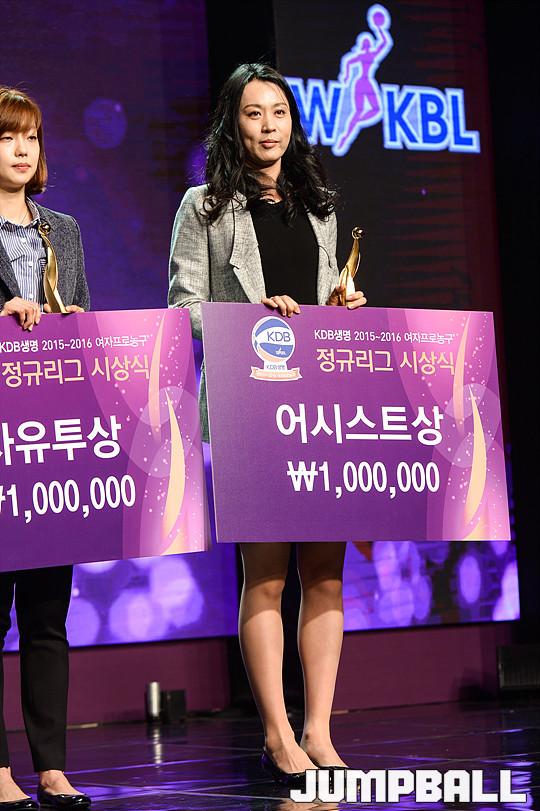 7일 여의도 63컨벤션센터에서 열린 KDB생명 2015-2016 여자프로농구 정규리그 시상식에서 올 시즌 최고의 기록을 낸 선수들이 가려졌다. 통계 부문상은 국내선수를 대상이 진행됐으며, 정규리그 35경기 중 23경기 이상 출전한 선수에 자격이 부여됐다.