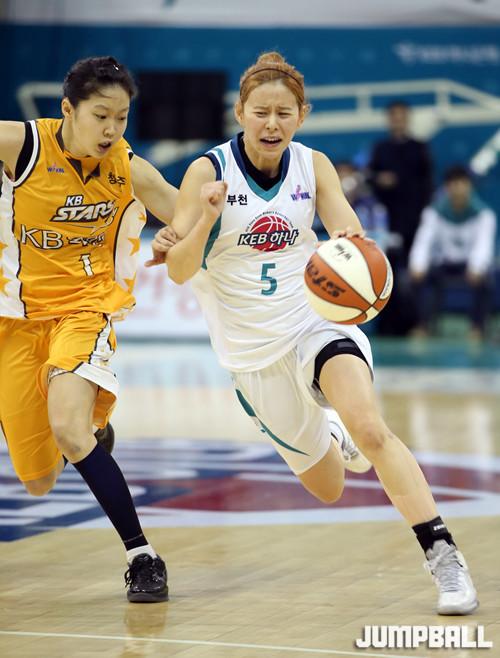 10일 부천 실내체육관에서 열린 2015-2016 여자프로농구 KEB하나은행과 KB스타즈의 플레이오프 경기에서 KEB하나은행 김이슬이 고교 선배인 KB스타즈의 홍아란과 치열한 몸싸움을 펼치며 앞으로 나가고 있다.