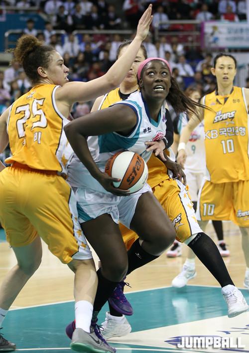 10일 부천 실내체육관에서 열린 2015-2016 여자프로농구 KEB하나은행과 KB스타즈의 플레이오프 경기에서 KEB하나은행 첼시리가 골밑에서 상대 수비 틈바구니에서 공격을 감행하고 있다.