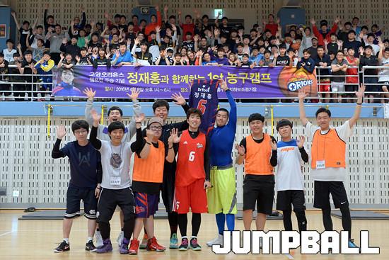 09일 고양 실내체육관 보조경기장에서 열린 고양오리온스 정재홍과 함께하는 1st 농구캠프에서, 고양 오리온 정재홍이 스탭진, 팬들과 함께 단체 사진을 촬영하였다.