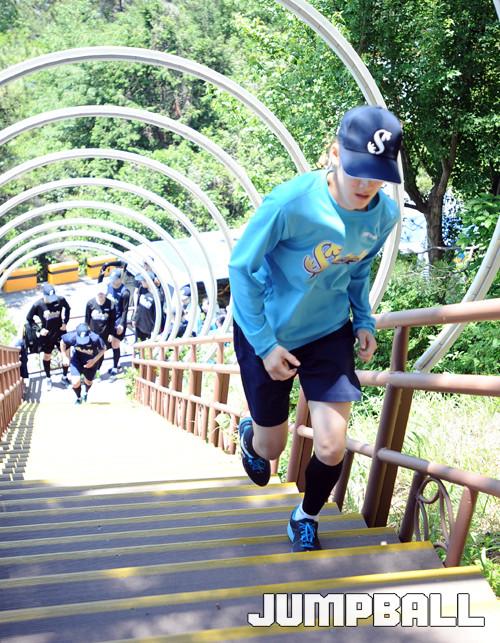 지난 18일 삼천포에서 만난 신한은행 선수들은 오전 9시, 웨이트트레이닝으로 하루일정을 시작했다. 이어 삼천포 근처 진양호에 위치한 일명 ‘365계단’을 쉼 없이 오르며 강도 높은 체력훈련을 이어갔다.