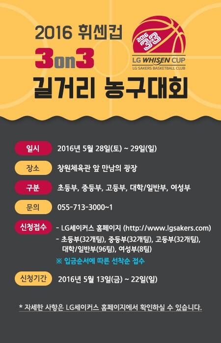[점프볼=곽현 기자] 프로농구 창원 LG 세이커스가 오는 28~29일 이틀간 창원스포츠파크 만남의 광장에서 ‘제16회 2016 LG휘센컵 3on3 길거리농구대회’를 개최한다.