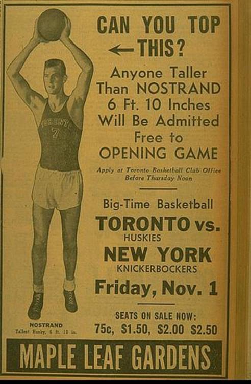 1946년 11월1일 드디어 역사적인 BAA의 첫 경기인 토론토 허스키스 대 뉴욕 닉스의 개막전이 메이플 리프스 가든스에서 열렸다. 입국심사관의 우려와 달리 당시 경기장에는 7,090명의 관중이 몰렸다. 물론 이들 중 아무도 노스트랜드보다 크지는 않았다.
