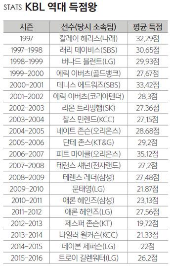 프로 원년 득점왕 칼레이 해리스(TG삼보)를 비롯해 에릭 이버츠(골드뱅크, 코리아텐더), 찰스 민렌드(KCC), 네이트 존슨(오리온스), 단테 존스(KT&G), 피트 마이클(오리온스) 등 득점왕은 그동안 해당 시즌 최고 외국선수들의 몫이었다. 이번 시즌 역시 국내선수 득점왕은 나오지 않았다. 득점왕은커녕 득점 순위 10위 내에 국내선수의 이름은 찾아 볼 수 없다. 국내선수 득점 1위 이정현(KGC 인삼공사)은 평균 15.45득점으로 전체 12위에 그쳤다. 1위 안드레 에밋(KCC)의 평균 득점인 29.04점과는 2배 가까이 차이가 난다.